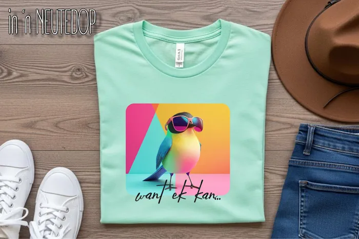 in 'n NEUTEDOP - Want ek kan (met agtergrond) T-shirt (other items are for display purposes only)